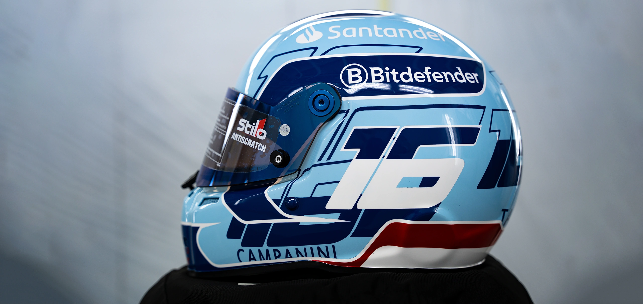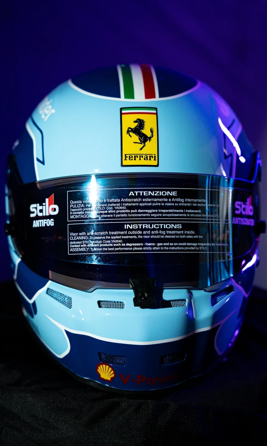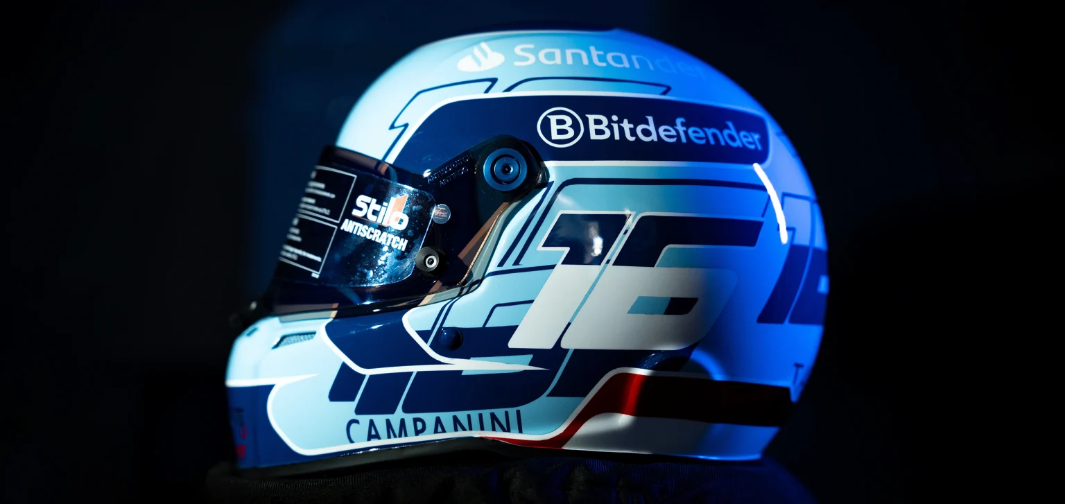 Abbandonando il viscerale rosso Maranello, Charles Leclerc abbraccia l’Azzurro La Plata, una tonalità pastello leggera e luminosa che richiama le tute storiche di piloti leggendari come Alberto Ascari.
