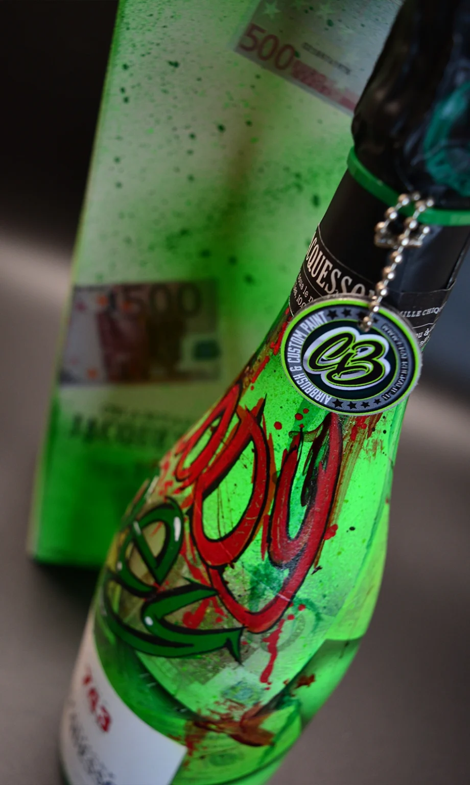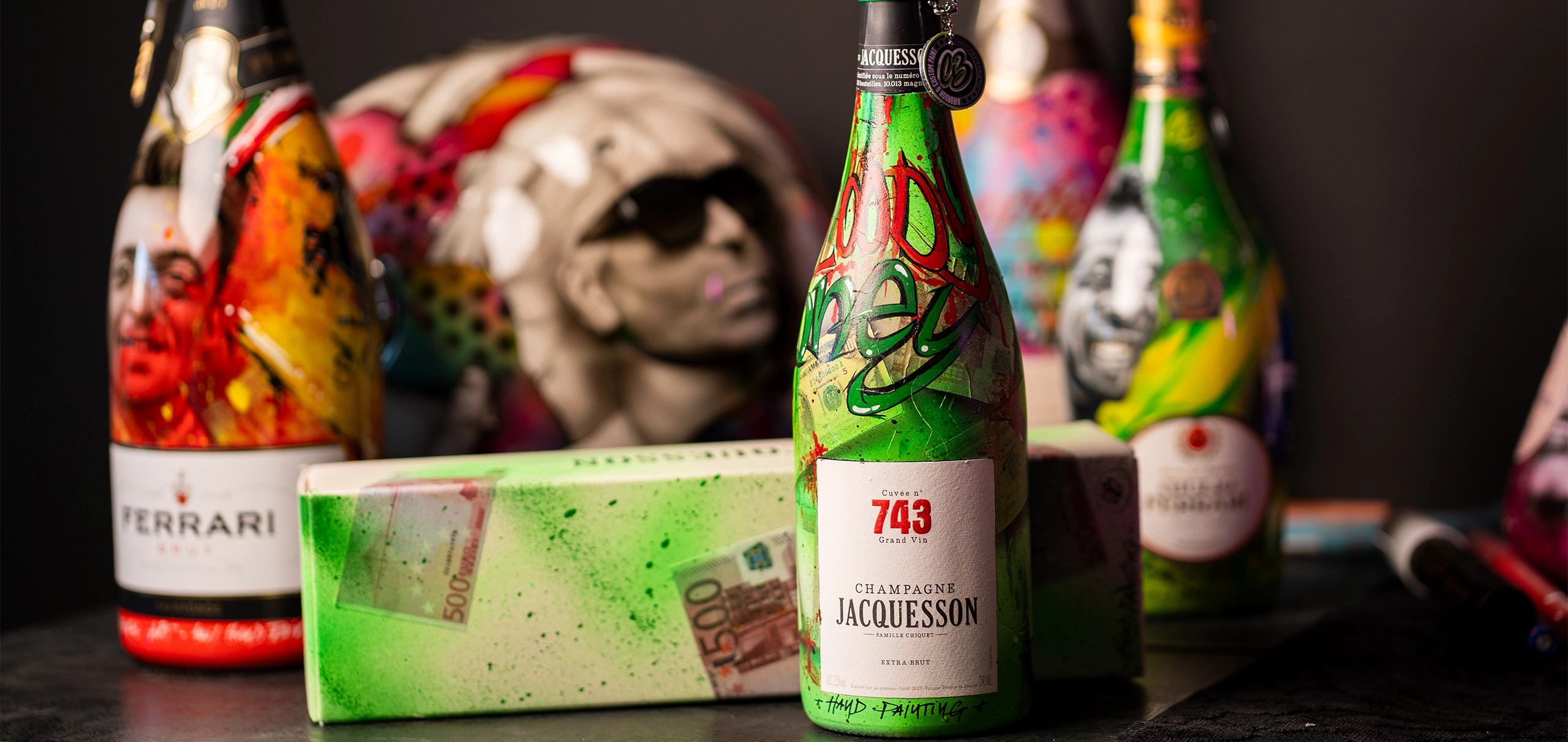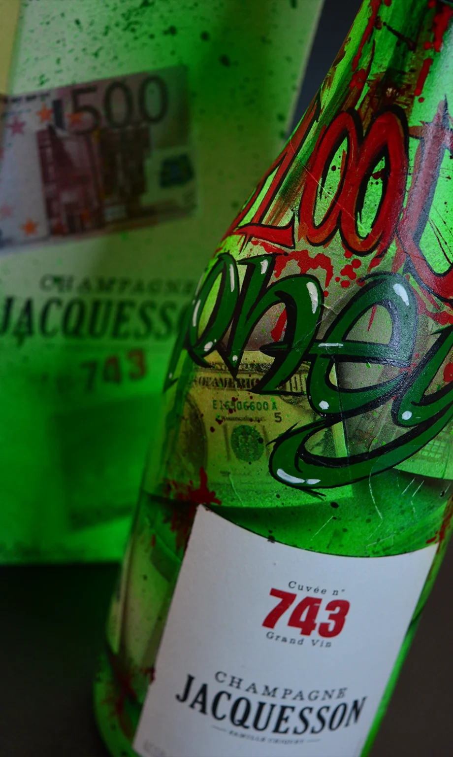Le bottiglie Jacquesson sono caratterizzate da un fondo verde neon con grafiche grafite in stile graffiti, dove spicca la scritta “Blood Money” in rosso sangue colante su una trama di banconote da 500 euro aerografate.