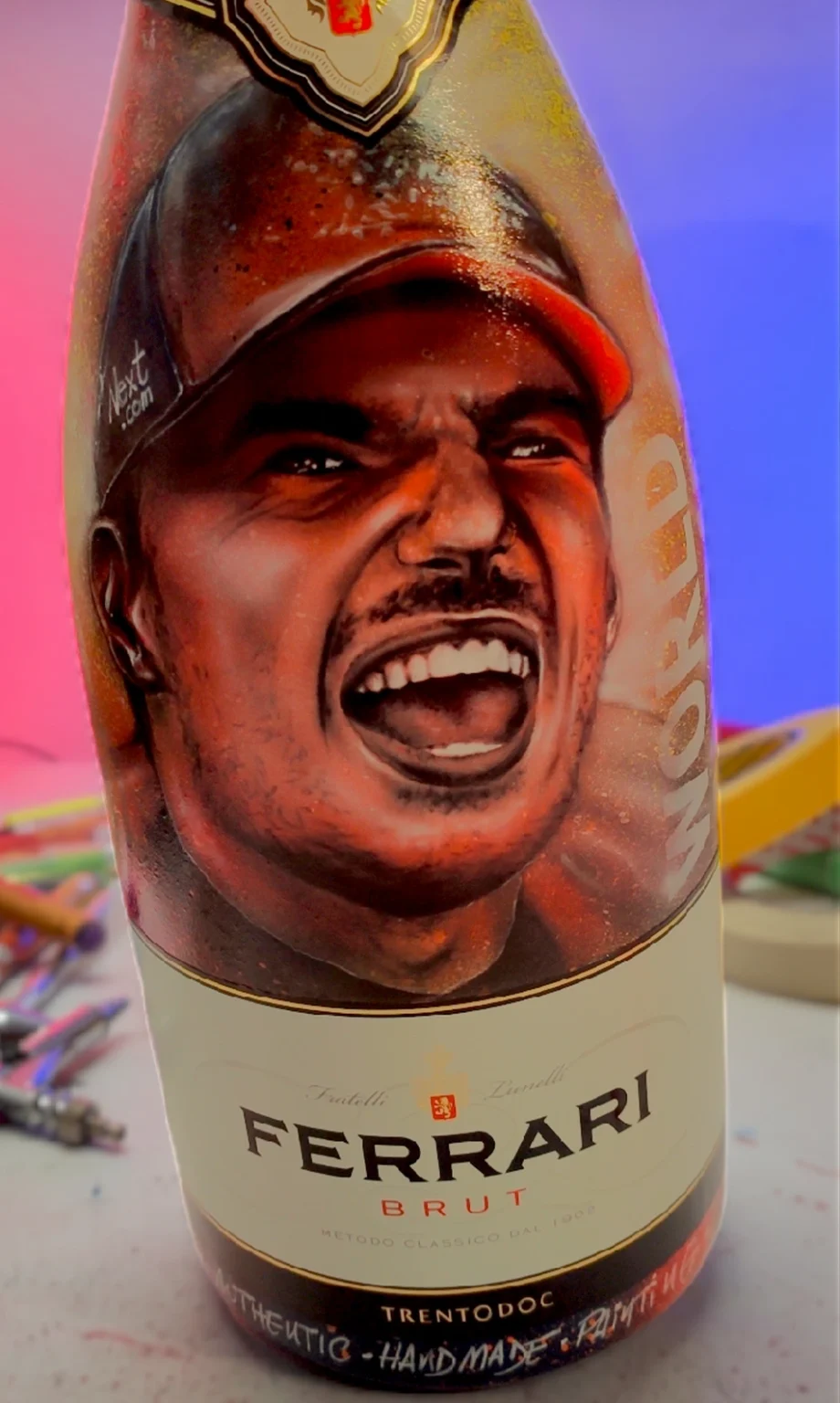 La bottiglia Ferrari Brut presenta un ritratto dettagliato del giovane Enzo Ferrari, reso con colori caldi e spruzzi di vernice “action painting” che ne modernizzano l’immagine storica.