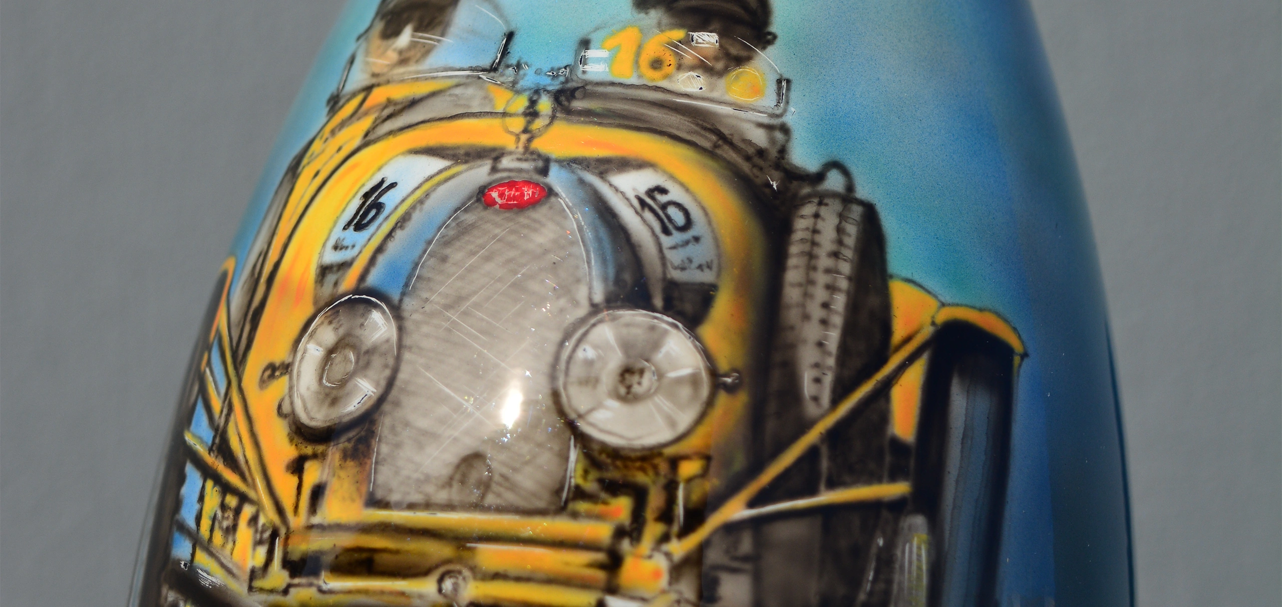 Il corpo della bottiglia è dominato da una rappresentazione dinamica di una Bugatti da corsa in una vibrante tonalità di giallo. La cura dei dettagli, dai fari circolari alla calandra a ferro di cavallo, evoca l’adrenalina delle competizioni storiche.